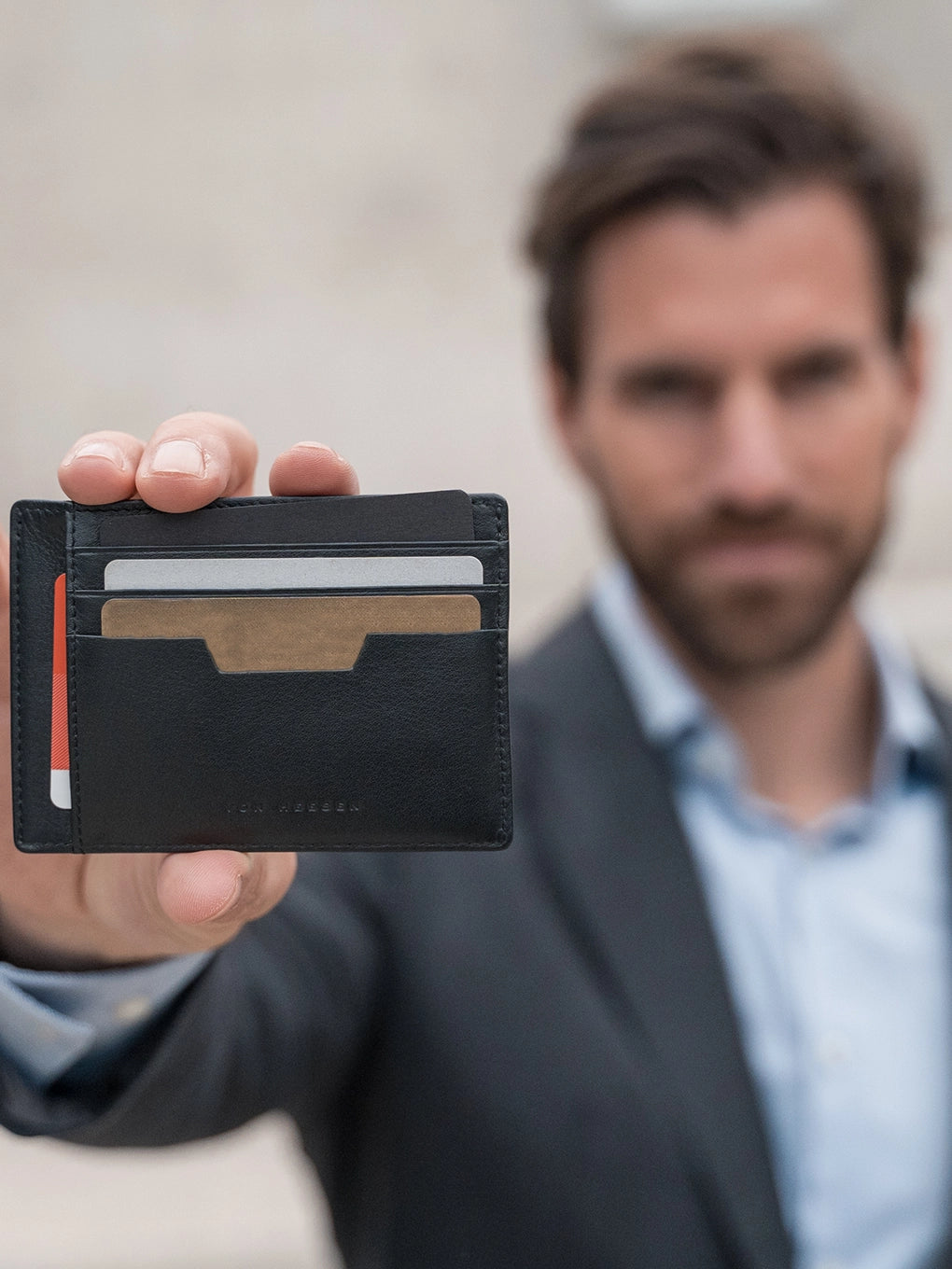 • Schlank trotz Inhalt: Flaches Etui für die Hosentasche; bleibt kompakt, auch mit mehreren Karten.