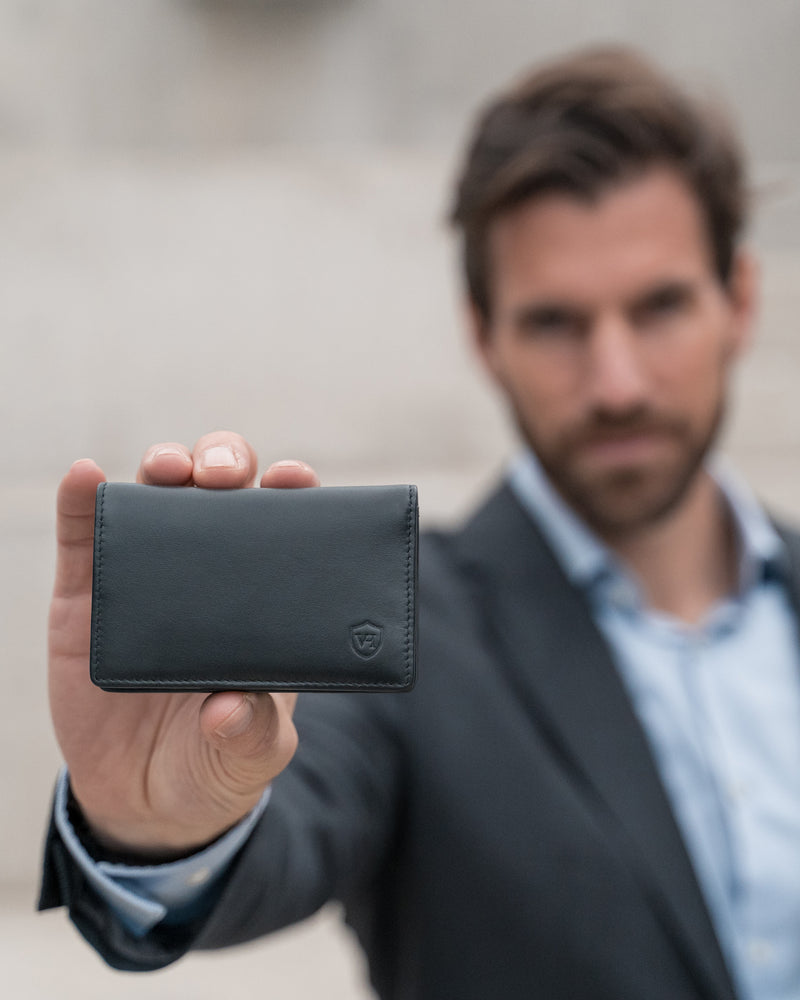 Dieses Visitenkartenetui unterstreicht deinen professionellen Auftritt. Deine Visitenkarten werden vor Schmutz und vor dem Verknicken geschützt – ideal für Meetings, Messen und Kundentermine. Echtes Leder und saubere Verarbeitung sorgen für Formstabilität und lange Haltbarkeit. Der eingebaute RFID-Schutz bewahrt sensible Karten vor unerwünschtem Auslesen.